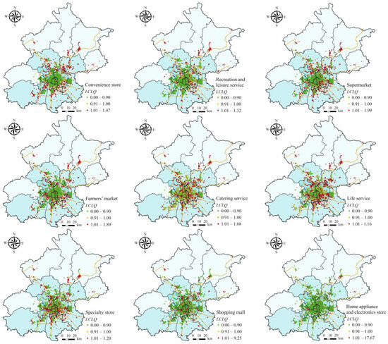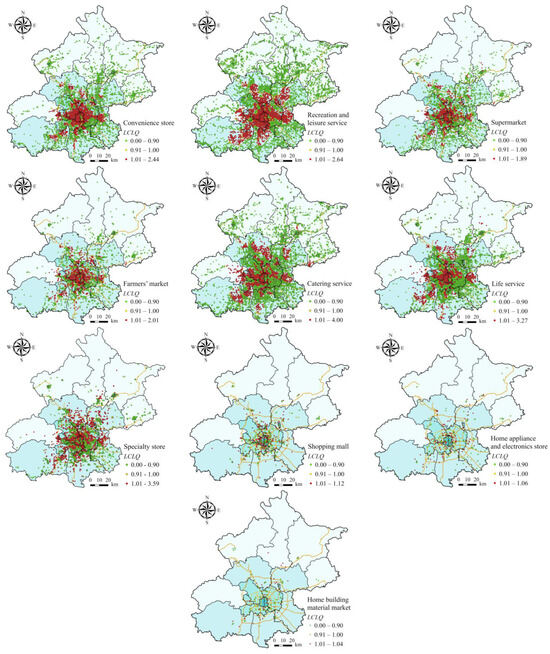 The LCLQR→Ci values of residences attracted by life and catering services gradually increase from the core area to the inner and outer suburbs (Figure 5). Life and catering services are commercial formats with daily high-frequency consumption. These services are numerous and widely distributed. Thus, their LCLQR→Ci values are often greater than 1 in large residential areas and in the vicinity of some commercial centers. Life service shows a strong spatial association with residences in various places, such as Jianguomen in the core area and CBD-Sanlitun, Muxiyuan-Shilihe, and Wangjing in the central area. Life service highly attracts residences in the centers of districts in the inner suburbs, such as Changping, Shunyi, Tongzhou, and Daxing. Most of the residences in the outer suburbs are concentrated around the commercial centers and have a strong spatial association with life service. Catering service exhibits a strong spatial association with residences in various places, such as Xidan-Jianguomen in the core area and Shuangyushu, CBD and Muxiyuan-Shilihe in the central area. Residences around the commercial centers in the inner and outer suburbs are attracted by catering services.
