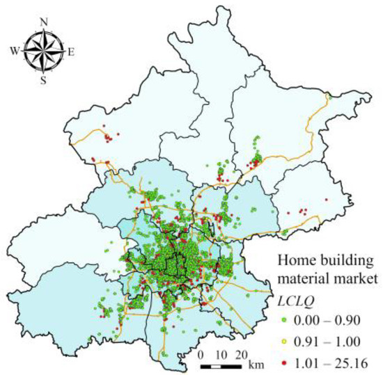 The LCLQR→Ci of residences attracted by the shopping mall, home building material market, and home appliance and electronics store are all low, showing that the distribution of residences is independent from the distribution of these three commercial formats. Given that shopping malls are often located in busy areas with convenient transportation, the degree of residences attracted is high around Xinjiekou, Financial Street–Xidan, Qianmen, and Jianguomen in the core area and Shuangyushu, Wukesong, Muxiyuan-Shilihe, and Sanlitun in the central area. Home building material markets and home appliance and electronics stores are non-daily consumption commercial formats with low consumption frequencies. They are mostly distributed in areas outside of the Third Ring Road with convenient transportation and low land prices. As a result, the LCLQR→Ci of residences attracted by home appliance and electronics stores and home building material markets is greater than 1 in areas around some commercial centers and on both sides of urban expressways or highways.