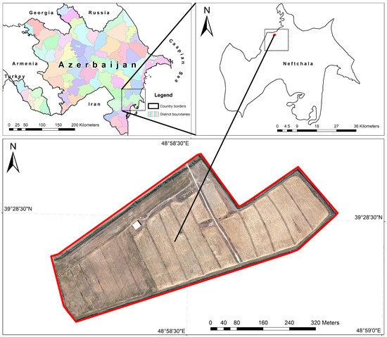 A plot of 22 hectares was selected for study, which has been using as a cotton field in the northwestern part of the Neftchala region (Figure 1). Both an irrigation canal and a collector has been built along the edges of the field. The sown area is 18 ha. The area is located on the Kura-Araz plain and −23 m below the level of the Baltic Sea.