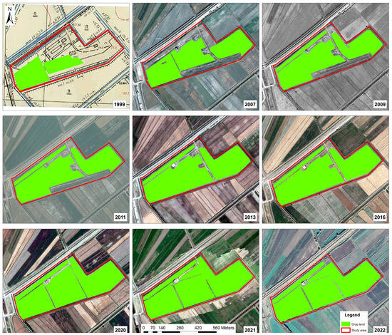 According to the topographic map from 1986 in the scale of 1:10,000 [21], the selected area served as an airbase for aerial application in agriculture (Figure 5). This airport also meant a drastic land use change, from arable land to areas with buildings and a runway of the airport made of concrete. Later on, the airfield was abolished in 1996 and the area was taken for cultivation by a farmer for the first time in 1999.