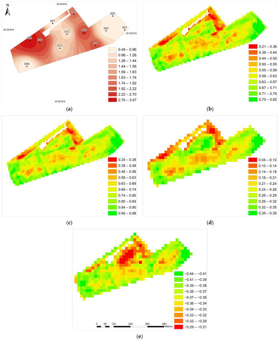 (a) EC (Geostatistical Analyst Tools, IDW); (b) Sentinel-2B, NDVI; (c) SAVI; (d) NDMI; (e) NDSI.