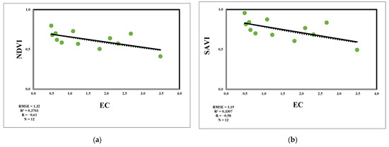 Coefficient of determination (R2): The R2 value represents the proportion of the variance in the dependent variable (e.g., NDVI, SAVI, NDMI, NDSI) that can be explained by the independent variable (EC). It is important to note that R2 is always a positive value, ranging from 0 to 1, and it reflects the strength of the relationship in a different way compared to R.