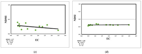 The graph of the relationship between the EC indicator and the mean of the indices: (a) EC–NDVI; (b) EC–SAVI; (c) EC–NDMI; (d) EC–NDSI.