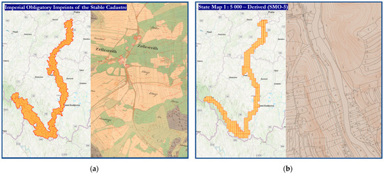 The first data set was created from scans of the Imperial obligatory imprints of the stable cadaster, shown in Figure 1a, which captures the land use information between 1821 and 1840. Roughly two cadastral areas on each side along the whole river valley (orange highlighted areas) were manually georeferenced, vectorized, and generalized. The final vectorization was then used as a source of land use data for the final visualization and as footprints for the creation of 3D models of buildings using procedural modeling. The final vectorization used in this case study is stored mainly as a geodatabase (*.gdb), and work data may be stored as shapefiles (*.shp) [1,3,6].
