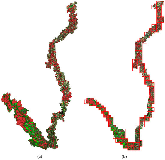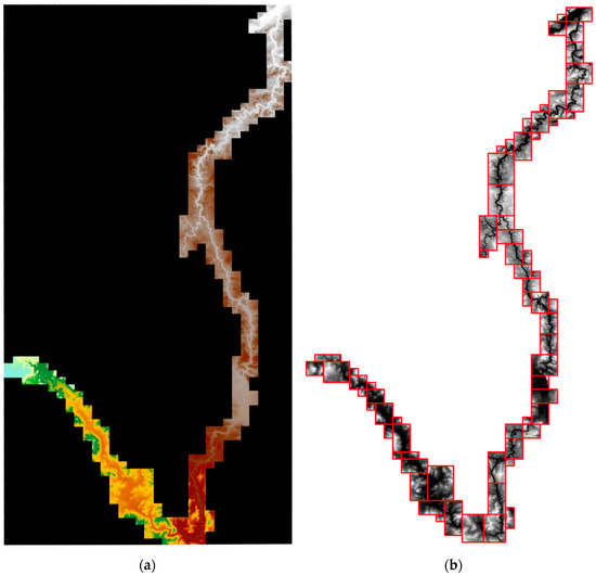 DTM of Vltava River valley: (a) as the original raster file; (b) divided into 68 pieces.
