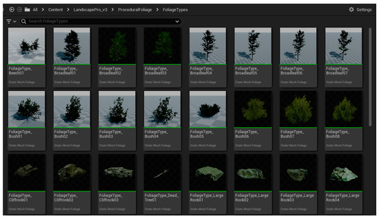 The first step is to display and use the land use data on top of the imported landscape. To do this, landscape layers within landscape material had to be defined. For this purpose, a plugin named Landscape Pro 3 was used. This plugin contains already-prepared materials for the landscape visualization and many textures, 3D models, actors, and other assets, as shown in Figure 4.