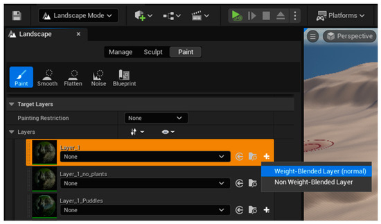 These were needed to visualize the land use information and procedurally generate grass, trees, rock formations, and other 3D models based on it to fill up the landscape and make it look organic, realistic, and detailed. After enabling the Landscape Pro 3 plugin, its landscape material was applied to the imported landscape by dragging the material file from the Content Browser plugin directory LandscapePro_v3 > Environments > Landscape to the landscape material attribute inside the landscape actor Details panel. This material file contains the definitions of each material layer, where each layer is composed of parameters, textures, normals, masks, and functions. These layers are then blended to create the final landscape material. Furthermore, this material file contains a Grass Output section that, depending on what layers are blended, procedurally generates ground foliage and 3D objects on top of the landscape. After applying the material, Layer Info must be manually created. To do so, the UE editor needs to be switched to Landscape Mode, and then under the Paint tab, for each layer, Layer Info must be created using the Create Layer Info (the + icon next to each layer) as shown in Figure 5.
