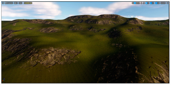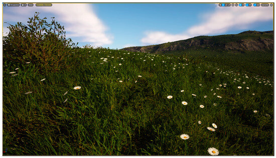 The global procedural generation that applies to all the material layers is defined directly within the material layer. It aims to generate vegetation that fills the entire landscape depending on the layers used. The first layer is the base (main) layer for the whole landscape. It does not require location definition as the other layers do and is applied automatically after the material is assigned to the landscape. After the assignment, it applies textures and generates 3D vegetation to the landscape. The generated vegetation consists of small and tall grasses, flowers, bushes, wooden branches, and other ground foliage shown in Figure 7, which is fully animated.