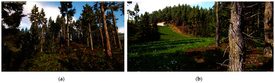 To procedurally generate any of the larger objects, such as broadleaf and needle trees, and rock formations, Procedural Foliage Spawner actors must be used. The spawner creates a bounding box, as shown in Figure 8a, that interacts with specific predefined material layers. This results in procedural generation being performed only on top of the matching material layer and within the bounds of the bounding box. Furthermore, the spawner controls which objects will be generated, as shown in Figure 8b. However, the Procedural Foliage option must first be enabled in the Editor Preferences to make procedural generation using the spawners work. Without it, the spawner actors cannot be added to the scene. Another tweaking was performed within the Project Settings, where the anti-aliasing method was changed to Temporal Anti-Aliasing (TAA) to remove flickering and shimmering effects from the animated foliage to create organic, realistic, and detailed foliage, as in Figure 9.