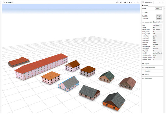 The primary method of creating 3D models of over 28,000 buildings was procedural modeling performed in CityEngine, as shown in Figure 10. However, these are not part of the input data for this case study since those models were only exported in a format compatible with ArcGIS Online at the time of their creation. Since one of this study’s goals is to recreate the Vltava Valley’s visualization, recreating those 28,000 models is also needed. The easiest way to create these models again is to use CityEngine and import them, either in the *.udatasmith format or any other format supported by UE (for example, glTF). However, because the case study aims to explore the usage of GIS data within UE, another solution has been used.