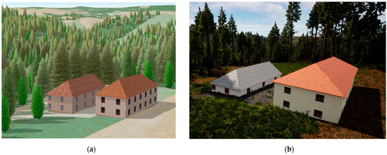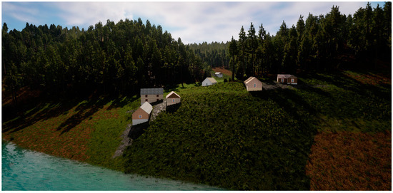 In terms of scale, it is safe to say that the visualized area was smaller than that in the Vltava Project and smaller than the attempted scale of this case study. Rome Reborn focuses on an urban area with a high density of buildings (7000) and a high density of significant buildings (250) [24]. In this case study (under the Vltava project), even though the visualized area is mainly composed of rural areas with large quantities of dense fields and forests, it has more procedurally modeled buildings (over 21,000), although in significantly less detail.