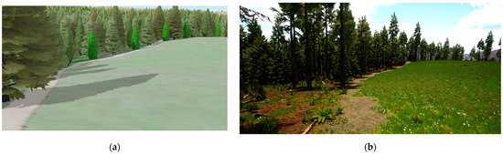 Procedurally generated needle tree forest in UE: (a) close view; (b) broader view.