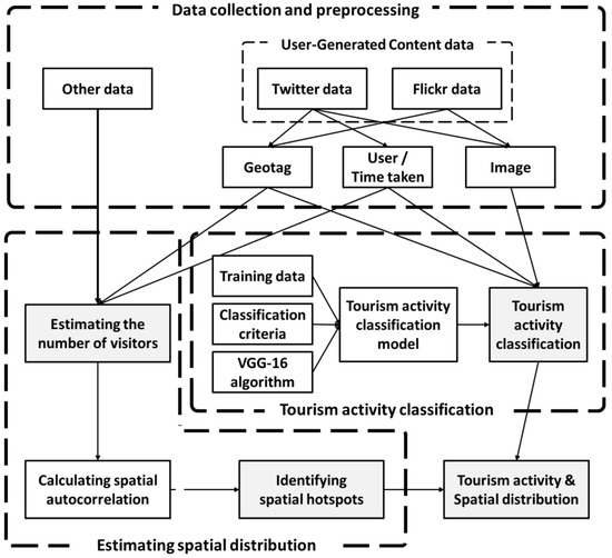 The selected model was applied to the collected geotagged Flickr images. Following the classification process, duplicates were removed based on the date, user, and tourism activities in each grid. The ratios of tourism activities were then calculated at the grid level (“Tourism activity classification” in Figure 2).