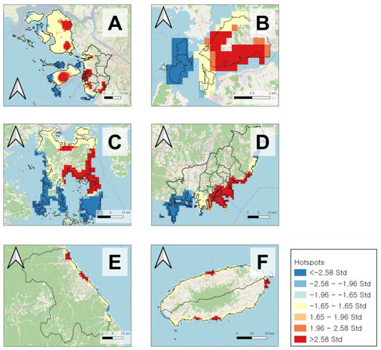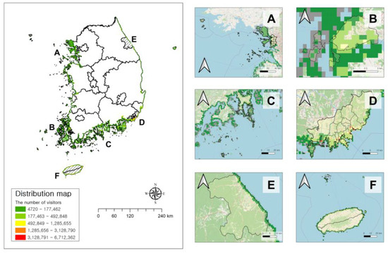 Coastal tourism hotspot map for each hotspot target ((A) is Incheon City, (B) is Mokpo City, (C) is Yeosu City, (D) is Busan City, (E) is Gangeung City, and (F) is Jeju Island).