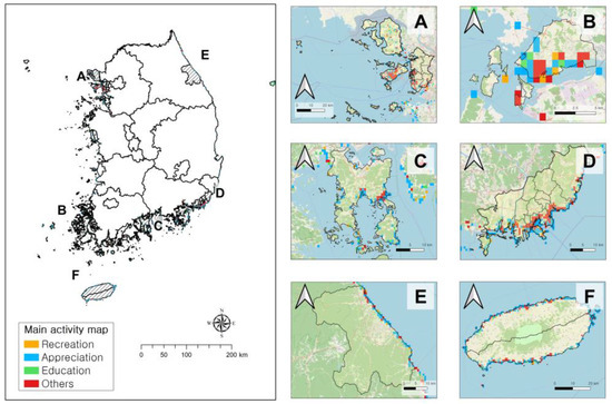 Main coastal tourism activity map representing tourism activities with the highest number of counts in each grid (number of grids corresponding to each activity is 146 for recreation, 219 for education, 1419 for appreciation, and 629 for other activities; A is Incheon City, B is Mokpo City, C is Yeosu City, D is Busan City, E is Gangeung City, and F is Jeju Island).