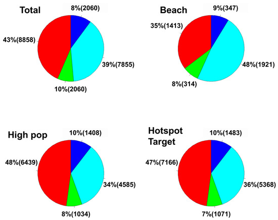 The distribution of coastal tourism activity categories across the study area is shown in Figure 6. Other and appreciation activities accounted for high percentages at 43% and 39%, respectively, whereas education and recreation had low values of 10% and 8%, respectively. In areas that included beaches, a significant increase in appreciation activities to 48% and a significant decrease in other activities to 35% were observed. In contrast, in grids with a denser-than-average population density (309 people/grid), other activities increased to 48%, and appreciation activities decreased to 34%. The data showed that in densely populated urban areas, other activities increased, while in natural coastal environments, such as beaches, appreciation activities that rely on the natural environment increased. The six hotspot target areas had a high percentage of other activities, which was similar to the distribution in densely populated areas.