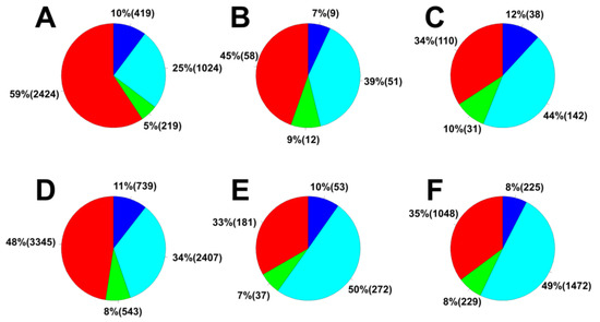 Pie graphs expressing the proportion of coastal tourism activities ((A) is Incheon City, (B) is Mokpo City, (C) is Yeosu City, (D) is Busan City, (E) is Gangeung City, and (F) is Jeju Island; blue is for recreation, sky blue is for appreciation, green is for education, and red is for other activities).