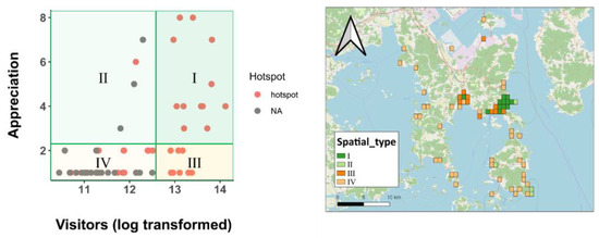By analyzing the visitor and activity distribution layers together, complex information can be derived. Taking appreciation activities as an example, after creating a distribution with the number of appreciation activities and the number of visitors as the axes, the grid type for appreciation activities can be specified by dividing the areas by the axes (Figure 8). In Figure 8, Grid Type I represents grids with a high number of visitors and a large proportion of appreciation activities, Grid Type II represents grids with a low number of visitors but a significant presence of appreciation activities, Grid Type III represents grids with a high number of visitors but a limited number of appreciation activities, and Grid Type IV represents grids with both a low number of visitors and few appreciation activities. In the case of Yeosu City, Grid Type I is mainly concentrated in the vicinity of the national park around Yeosu EXPO Station, while Grid Type II, which occupies a smaller number of grids, is located within the national park area or near the Hangilam heritage site located to the south.