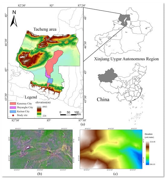 Overview of the study area. (a) Geographic location of the study area, (b) visible light image of the study area, and (c) DEM image of the study area.