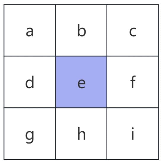 In this research, solely the slope of the DEM is computed, while the slope direction is not considered. It is presumed that the projection region of the car is a grid cell. The values of the central pixel and its eight adjacent pixels determine the horizontal and vertical increments. These adjacent pixels are identified by letters a to i, where e represents the pixel for which the slope is currently being calculated, as shown in Figure 2. Utilizing this information, Equations (1) and (2) calculate the slope in the X orientation and the slope in the Y orientation , respectively.