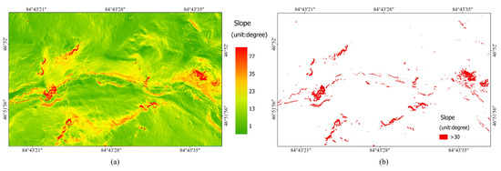 Slope map of the study area. (a) Slope map of the study area and (b) slopes of the areas exceeding 30°.