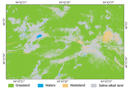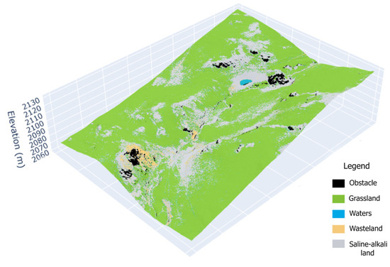 Different land cover types have different effects on the vehicle speed, so high-precision unmanned aerial vehicle (UAV) photography data are subjected to supervised classification operations, and the support vector machine method is used to obtain four land cover types—grassland, water areas, wasteland, and saline—alkali land—from the image data. The kappa coefficient is 0.94. The outcomes are presented in Figure 4.
