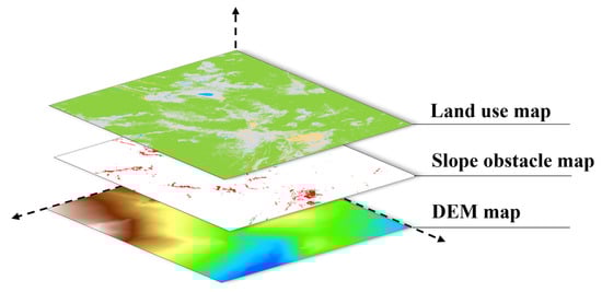 After modeling the various attribute layers, they need to be overlaid for analysis purposes to complete the field environment modeling task. The traditional method is to map the above data into grid coordinates to establish an environmental model [40]. This method offers advantages such as a straightforward data structure, ease of performing spatial analysis, and the integration of multilevel spatial data. However, the resulting map remains a conventional single-layer map. Therefore, this research adopts an improved method [41] to enhance the simple data structure and construct a multilevel feature map for storing land cover information, slope obstacles, and 3D coordinate information, as shown in Figure 5. This approach effectively preserves the environmental trait data and enhances the maintainability of the cost map. The overlay algorithm first employs the DEM data as the base layer to display the terrain information for the experiment. Next, the land use data are overlaid on top of the DEM layer, utilizing specific color mappings to visualize different land cover types. Finally, the obstacle layer is superimposed at the corresponding positions based on precise coordinate information, thereby completing the modeling process of the real-world 3D environment. The consequent map is illustrated in Figure 6.