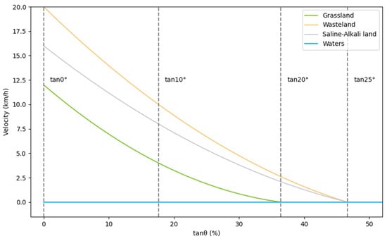 In a field environment, the main factors affecting passability are the types of surface features that are present and the terrain slope. Taking an off-road vehicle as an example, field experiments were conducted to measure the vehicle’s speed under different slopes and terrain types. The Aowei Interactive Map software 10.1.3 was used to record the vehicle’s speed under the same power conditions across different slopes and land cover types. Given the difficulty of maintaining constant vehicle power, the experiment involved observing and controlling the vehicle’s RPM, keeping it as stable as possible around a fixed value to idealize this process. Ultimately, the experiment determined the rate of speed reduction under various conditions. Based on its driving characteristics in different surface environments, the driving speeds produced for four representative types of features, namely, grassland, wasteland, saline—alkali land, and water, and corresponding to three typical slope values are given [42]. As shown in Table 1, the maximum passable slope of the vehicle varies under different surface conditions. Flat land, that is, terrain with a slope of 0°, generally has the maximum passable speed. While ensuring the safety of field driving, the speed should be appropriately reduced when moving downhill. For simplicity, the same speed as that of going uphill is used. According to general experience, 10° is the middle value with the highest slope value frequency, so it is taken as a typical slope value.