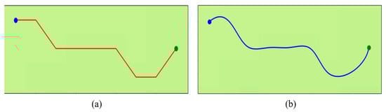 Implementation of path smoothing function. (a) Traditional path planning results; (b) Path planning results after improving the path smoothing function.