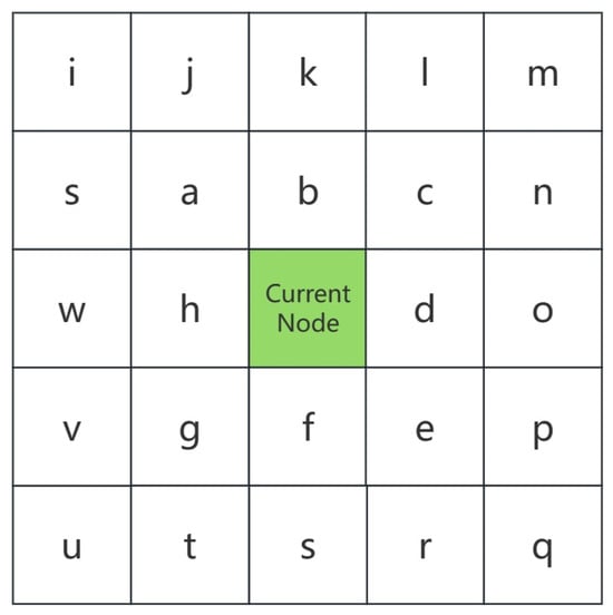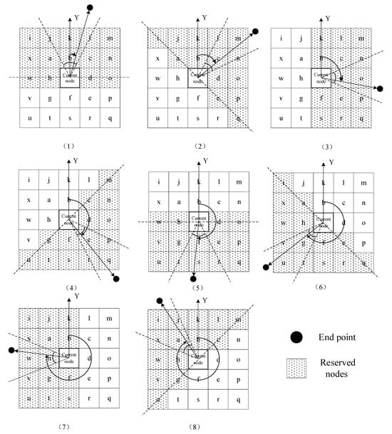 The conventional A* algorithm examines eight neighboring nodes around the current node. Building on the original search method, the search directions have been extended to encompass 24 directions, as shown in Figure 9, which increases the freedom of the search and reduces the count of encountered turning points. However, the 24-direction search method increases the count of search nodes and reduces the search effectiveness. Therefore, the expanded 24-neighborhood search is improved to a dynamic 14-neighborhood search, which increases the search effectiveness and reduces the count of search nodes. The retained node is selected by determining the angle between the positive direction of the vertical line of the current node and the direction of the line connecting the current node and the end point. Figure 10 shows the search method. Table 2 provides the search rules.