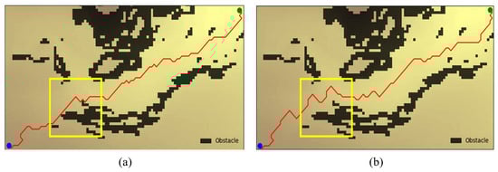 In path planning for vehicles driving in off-road environments, improving the smoothness of the path is of critical importance. A smooth path can significantly enhance driving safety by reducing sharp turns and frequent direction changes, thereby lowering the risk of vehicle loss of control or rollover, especially in rugged terrains and complex obstacle environments. To address this issue, a path smoothing function is incorporated into the evaluation function of the improved algorithm to ensure the safety and practicality of the path planning. As shown in Figure 8, (a) represents the path planning results without smoothing, and (b) represents the path planning results after applying the path smoothing function. It can be observed from the figure that the smoothed path has significant advantages compared to the original path.