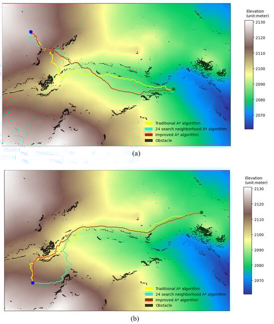 Shortest path planning results obtained under the influence of terrain. (a) Comparison experimental results of the traditional A* algorithm, the 24-neighborhood A* algorithm, and the improved A* Algorithm for Path 1; (b) Comparison experimental results of the traditional A* algorithm, 24-neighborhood A* algorithm, and the improved A* Algorithm for Path 2.
