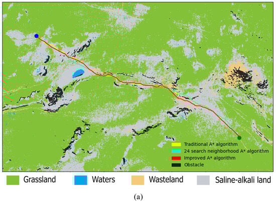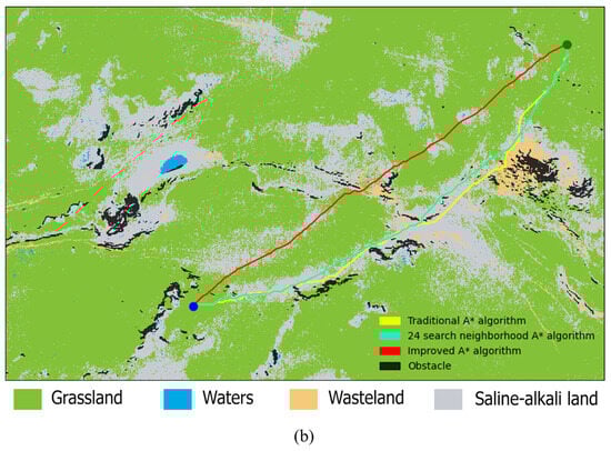 The paths with the shortest travel times planned under the influence of land cover. (a) Comparison experimental results of the traditional A* algorithm, the 24-neighborhood A* algorithm, and the improved A* Algorithm for Path 1; (b) Comparison experimental results of the traditional A* algorithm, 24-neighborhood A* algorithm, and the improved A* Algorithm for Path 2.