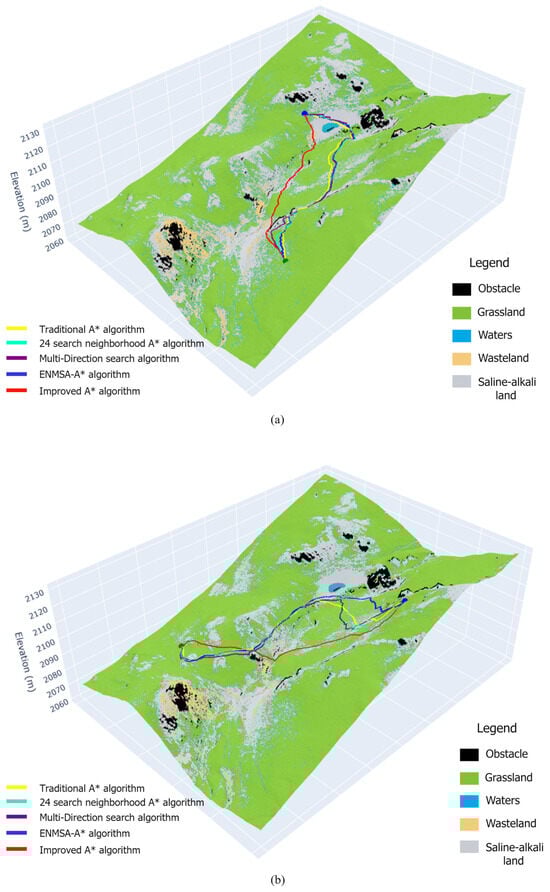 Optimal path planning results under the combined influence of terrain and land cover factors. (a) Comparative experimental results of five different algorithms on Path 1; (b) Comparative experimental results of five different algorithms on Path 2.