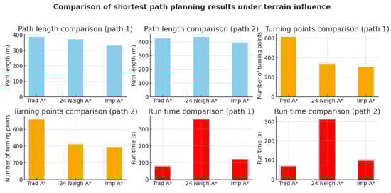 As indicated in Table 4, for field path 1, the improved A* algorithm reduces the path length by 2.92%, the count of turning points by 39.26%, and travel time by 4.48% compared to the traditional A* algorithm. For field path 2, the improved algorithm decreases the path length by 9.85%, the count of turning points by 51.55%, and travel time by 3.41%. By combining the two results, it can be seen that in terms of the impact of land cover on the resulting travel time and path length, the improved A* algorithm has a small advantage. The 24-neighborhood A* algorithm performs the best in terms of travel time, but it has the longest running time.