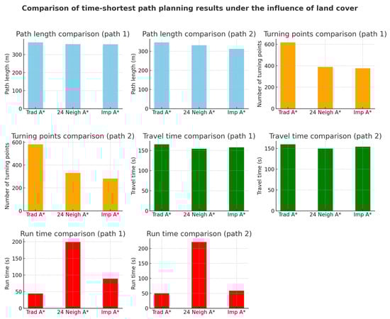 In the shortest path planning experiments conducted under the influence of land cover, a travel time judgment term is added to the A* algorithm. Since terrain conditions are not considered, only the influence of the land cover type on the speed of vehicle travel is considered. The experiments are conducted using different search methods. The outcomes of the experiment are illustrated in Figure 17. The improved algorithm provides small path length and travel time improvements over those of the traditional 8-neighborhood search method and greatly optimizes the number of turning points. The improved algorithm has a significant improvement in running time compared to the 24-neighborhood algorithm. The above two experiments prove that the improved dynamic 14-neighborhood search method yields good path distance and travel time improvements over the traditional 8-neighborhood search, and the number of turning points is also significantly reduced.