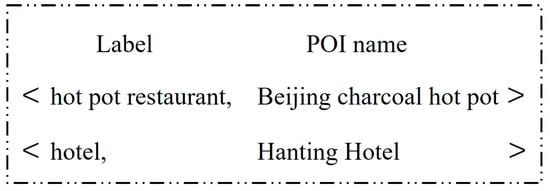 Currently, the majority of classification methods implicitly learn the semantic knowledge of different categories from the training dataset, yet they often neglect the explicit semantic information embedded within the natural language labels of these categories. As can be seen from Figure 1, by introducing labels, the category of POI names can be easily determined through terms like “hot pot” or “hotel” within their respective names. POI data labels often act as keywords within their names, and incorporating this explicit semantic information provided by the labels is highly beneficial for POI category recognition. Therefore, this study employs POI data labels to enhance semantic understanding, offering explicit information for the semantic categorization of POIs.