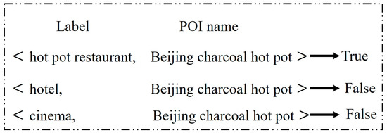 This study employs the pretrained Chinese model RoBERTa, which features 12 layers, with each layer containing 12 self-attention heads and 768 hidden nodes. For the POI data classification task encompassing categories, it is necessary to generate pairs of <label, POI name> for each input instance. For example, if the label of the -th input corresponds to the category of the POI name, this results in a positive training example: (<, POI name>, True). Conversely, for ( − 1) negative instances, the labels do not correspond to the POI name’s category, represented as (<, POI name>, False), with the stipulation that . Figure 3 illustrates the scenario with two negative samples.
