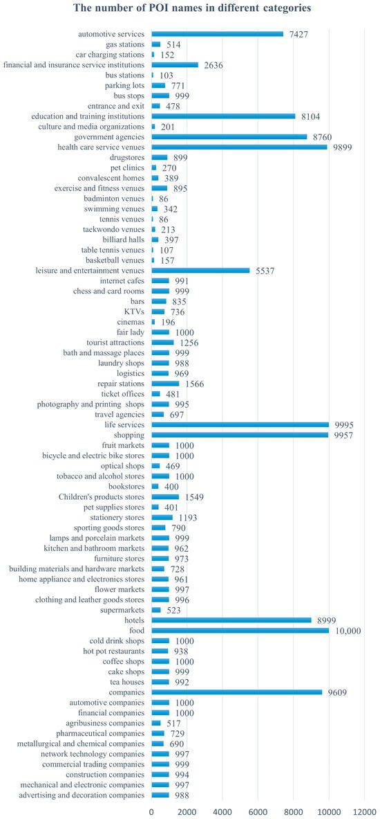 In this study, we collected 1,111,554 pieces of POI data from Hangzhou City. Due to the messiness of the POI data, a cleaning process was undertaken that encompassed the following steps: (1) removing the spaces and special symbols (e.g., “/”, “—”) contained in the POI names; (2) deleting duplicate data by simply removing entries with identical names; and (3) conducting POI data category processing, which included the manual refinement of categories, and filtering based on the POI classification of Baidu Maps and the keywords contained in the names. Following the processing of the POI data, a total of 139,471 unique POI names were selected. The number of different categories is illustrated in Figure 4. As depicted in Figure 4, there is considerable variation in the quantity of POI names among different categories, with some categories encompassing 10,000 POI names while others have less than 200. Categories that have a higher volume of POI names are assigned to the first-level classification, with the objective of improving the accuracy of recognition at this level. Ultimately, the selected data were partitioned into three distinct segments: a training dataset, a test dataset, and a validation dataset, allocated in the proportions of 60%, 20%, and 20%, respectively.