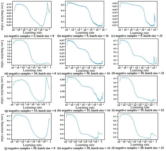 The relationship between loss function value and learning rate under different numbers of negative samples and batch sizes.