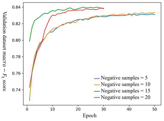 Once the optimal hyperparameters for the model under various conditions of negative samples were established, we initiated the training process. As shown in Figure 6, the scores were obtained from the validation dataset across varying numbers of negative samples. For different numbers of negative samples, different epochs were set. When the number of negative samples is 5, 10, 15, and 20, the corresponding maximum scores of on the validation dataset are 0.8317, 0.8334, 0.84, and 0.8389, respectively, achieved at the 49th, 45th, 22nd, and 29th epochs. Therefore, it is recommended to set the number of negative samples to 15.