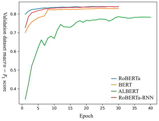 As can be seen in Figure 7, the validation dataset’s scores are presented across different methodologies. The figure clearly illustrates that distinct methods exhibit varied convergence behaviors, with each requiring a different number of epochs to achieve convergence. When considering RoBERTa, BERT, and ALBERT—all of which convert multi-classification tasks into binary classification problems—the optimal scores on the validation dataset are 0.84, 0.8306, and 0.7858, respectively. Significantly, the corresponding scores for the test dataset are slightly higher, at 0.84, 0.834, and 0.788, respectively. This observation highlights the models’ impressive generalization capabilities. The initial two models exhibit markedly higher scores on both the validation and test datasets in comparison to ALBERT, reflecting the relatively weaker capacity of ALBERT in capturing semantic information between sentence pairs. The method proposed in this study outperforms the other two methods in scores in both the validation dataset and the test dataset, thus validating the effectiveness of the method proposed in this study.