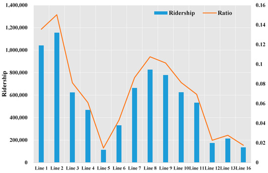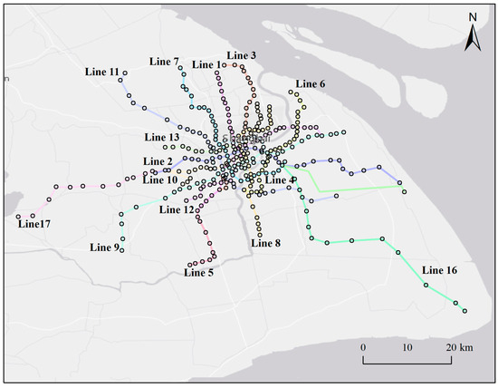 This study focuses on the Shanghai Metro, the longest urban rail transit system in China and one of the largest in the world. As of December 2018, the Shanghai Metro comprises 16 operational lines that span a total mileage of 705 km and connect 415 stations (Figure 1). The system is a crucial component of Shanghai’s transportation infrastructure, facilitating the daily commutes of millions and playing a significant role in the city’s urban mobility dynamics. The Shanghai Metro operates in a highly diverse urban environment, where factors such as land use, population density, and economic activities surrounding the metro stations can greatly influence ridership patterns. In peak periods, the Shanghai Metro is vital for accommodating the high flow of passengers, reaching a record daily passenger traffic of approximately 13.294 million on 8 March 2018. The selection of March for data analysis is particularly relevant, as this month represents a period of stable operational conditions for the Shanghai Metro, devoid of significant seasonal fluctuations in ridership that can occur during holidays. This helps ensure that the results obtained from the analysis reflect typical usage patterns and contribute to a deeper understanding of how built environment factors interact with temporal variations in metro ridership.
