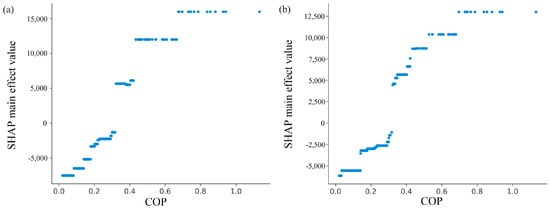 In the SHAP summary plot, the vertical axis represents the factors in the XGBoost model, with the factors ranked from top to bottom based on their contributions to changes in ridership. The horizontal axis represents the SHAP value, which indicates the impact of each factor on the model’s output. Positive SHAP values signify an increase in metro ridership, while negative SHAP values indicate a decrease. In the summary plots, each dot represents a metro station. Red dots indicate that the value of the factor/feature is relatively high, while blue dots indicate that the value is low. For example, the COP factor represents the most significant influence on ridership changes in both the weekday and weekend models. The red portion of its SHAP values indicates a negative impact, meaning that an increase in commercial POIs within the station area significantly reduces station-level ridership (relative average change in passenger flow).