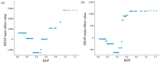 Consistent with previous studies [30,31], we found that residential POIs significantly impact metro ridership. From the SHAP main effect value plot (Figure 6), we can observe that the residence POI factor is the fourth most influential factor in both the weekday and weekend XGBoost models. We can clearly notice the nonlinear characteristics of this factor: when the number of residence POIs around a station is relatively small, the change in station-level ridership decreases with the increase in the number of residence POIs. However, when the number of residence POIs around a station is greater than approximately 0.5, the station-level ridership increases with the increase in the number of residence POIs. This relationship can be understood as a piecewise function, where the impact of residential POIs on ridership changes direction at a certain threshold.