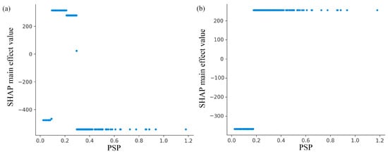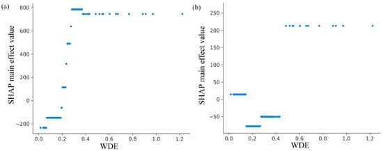 In Figure 7, the public service POI plays an important role in increasing station-level ridership in the weekend XGBoost model. However, in the weekday XGBoost model, this factor shows the opposite effect. From the SHAP main effect value plot of the public service POI (Figure 6), the curve shows an obvious nonlinear effect. We can clearly notice that when the number of comments is within a certain value, it has no effect on the change in ridership. Here, we can understand that some public service POIs will not significantly affect travel on weekdays.