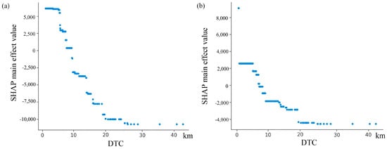 SHAP main effect value for distance to CBDs: (a) weekday and (b) weekend.