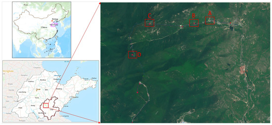 The study area. (A. Tourist Center B. Xiaodiao Area C. Cable Car Area D. Yu Huang Palace).