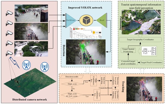 To meet the real-time requirements for passive tourist detection in mountainous scenic areas and overcome the challenges of object detection in complex environments, we ultimately propose a method that integrates distributed cameras with positioning technology. By real-time processing of RTSP video streams from distributed cameras using a trained YOLOX model for tourist detection and tracking, and applying a passive geospatial positioning method based on monocular cameras aligned with the BeiDou time–space benchmark, we achieve detection, tracking, and positioning of tourists in these challenging environments. Our objectives include (1) high-precision detection of small, distant tourists in outdoor video frames; (2) dynamic tracking of tourist movements under complex and occluded conditions; and (3) facilitating near-field perception by combining monocular camera geographic positioning with multi-channel video data in mountainous scenic areas.