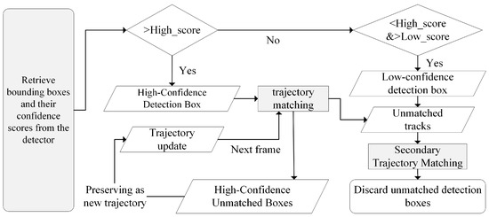 Flowchart of dynamic tourist target tracking. The arrows in the figure represent the flow of information between different steps in the process. Solid arrows indicate the progression of bounding box detections through various stages, such as confidence evaluation, trajectory matching, and updates. Arrows leading to decision diamonds represent branching based on confidence score thresholds. Unmatched detection boxes and tracks follow separate arrows indicating secondary matching or discarding processes.
